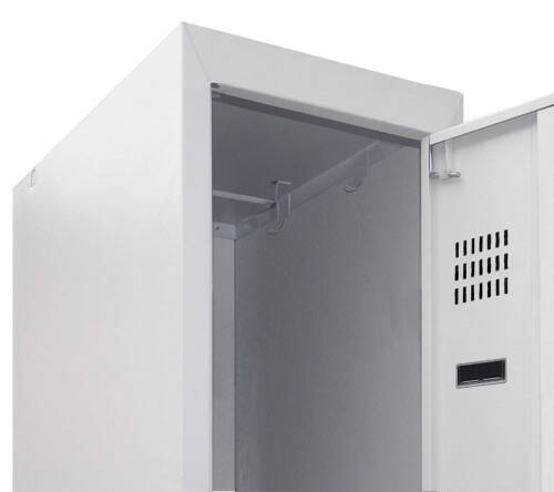 Кожна секція шафи обладнана 4 гачками для легкого підвішування одягу, перекладеною для вішаків, а також поличкою для зручного розміщення речей. Крім того, кожна секція оснащена врізним механічним замком типу прапорця з двома ключами для забезпечення максимальної безпеки зберігання. Таким чином, шафи одягові металеві є надійним та функціональним рішенням для організації зберігання одягу у будь-якому приміщенні.