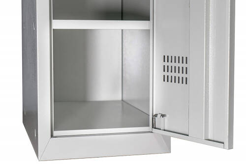 Виготовлені з високоякісної холоднокатаної тонколистової сталі, шафи мають спеціальне антикорозійне покриття, яке наноситься у порошковій формі. Це забезпечує не лише естетичний зовнішній вигляд, але й забезпечує захист від корозії та інших видів пошкоджень. На додаток, світло-сірий колір зварених лав узгоджується з відтінком металевих шаф RAL 7035, створюючи враження єдності та стилю всього приміщення.
