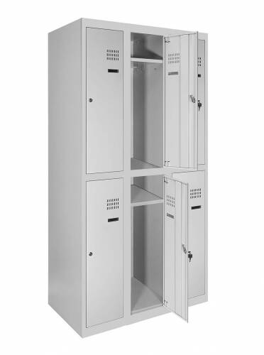 Кожна секція шафи обладнана 4 гачками для легкого підвішування одягу, перекладеною для вішаків, а також поличкою для зручного розміщення речей. Крім того, кожна секція оснащена врізним механічним замком типу прапорця з двома ключами для забезпечення максимальної безпеки зберігання. Таким чином, шафи одягові металеві є надійним та функціональним рішенням для організації зберігання одягу у будь-якому приміщенні.