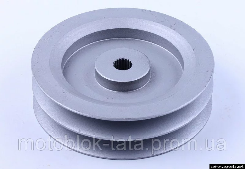 Шкив ремня редуктора ведомый 2а ручья 168F/170F подходит на ременной редуктор мотоблоков, культиваторов и др., мощностью 6,5/7 л.с. с воздушным охлаждением. Размеры: ?140mm, H-40mm. Под ремень профиль - "B". Посадочный размер: ?14mm, Z-19. Вес: 1710 гр.