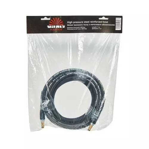 Цей шланг гарантовано витримує тиск до 200 бар. Внутрішній діаметр шланга - 8 міліметрів, що забезпечує високу пропускну здатність. Довжина шланга 7 метрів, що дозволяє мити великі об'єкти, наприклад, позашляховик або мікроавтобус, при цьому не переміщуючи мийку по майданчику. За конструкцією шланг високого тиску Vitals 200Bar є товстостінний еластичний трубопровід з полімерного матеріалу в обплетенні із полівінілхлориду з тканинним зовнішнім захисним покриттям. Шланг армований спіральною дротяною навивкою із нержавіючої сталі.
