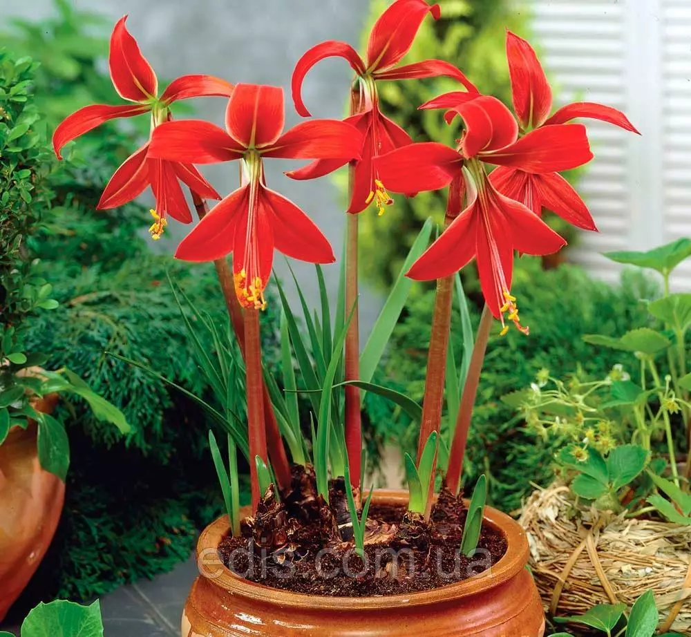 Цветок располагается на длинном полом цветоносе. По форме он воронковидный. Окраска цветков насыщенно красная. Три лепестка подняты вверх, а три нижних образуют трубку, из которой показываются тычинки. Пыльники ярко-желтые, тычиночные нити красные. Цветет весной или раним летом. Луковица с вытянутой шейкой, около 5 см в диаметре, черноватая, с темно-красными штрихами. Чтобы растение цвело ему необходимо как минимум 4 часа в день яркого солнца.