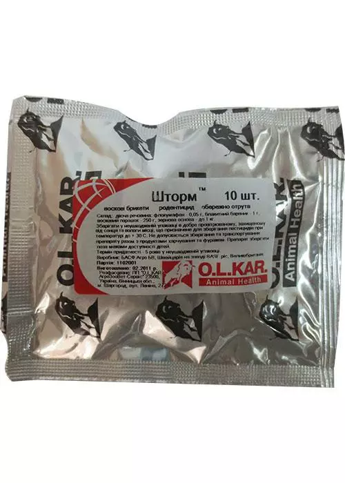 Засіб «Шторм» являє собою готові до застосування воскові брикети блакитного кольору, що містять в якості ДВ - флокумафен (0,005%).
