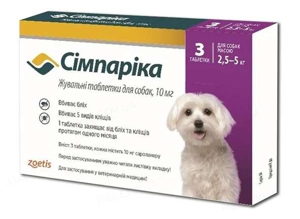 Сімпаріка таблетки для собак від бліх і кліщів 10 мг (2,5-5 кг) 1 упаковка (3 табл.) Zoetis, (термін придатності до 08.2026 р)