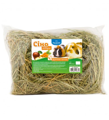 Сіно необхідне для всіх гризунів, щоб забезпечити правильне травлення та постійне сточування зубів. Сіно «Фруктово-овочеве» має привабливий запах, що пробуджує апетит улюбленців. Сухі фрукти та овочі доповнюють раціон улюбленців вітамінами, пектинами, фруктовими кислотами. Це сіно рекомендовано застосовувати як вітамінний додаток до раціону. Також сіно є чудовою екологічною підстилкою.
