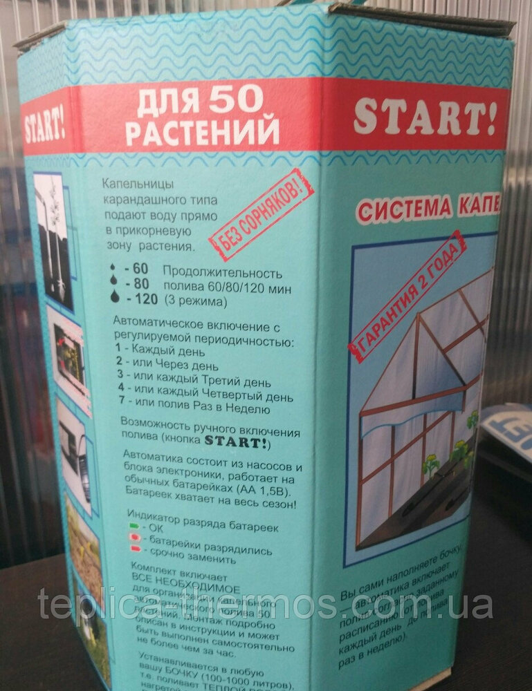 АкваДуся Start 50 - це автоматична система крапельного поливу, призначена на 50 кущів. Система сама буде включатися тоді, коли рослинам потрібна вода і при цьому подасть її прямо до коріння, а не на листя. Щорічно вирішує питання поливу на весь сезон. Підключається до будь-якої наявної у Вас бочки, яка може бути під'єднана до водопроводу для автоматичного поповнення через замикаючий поплавець. Запуск і зупинка поливу здійснюється блоком насосу, зануреним в бочку (запатентована технологія). Немає необхідності робити в бочці дірку - вода надходить по перекинутому через верх бочки шлангу. Батарейок вистачає на весь сезон - насос включається ненадовго, тільки для запуску поливу, а далі вода надходить самопливом. Немає необхідності піднімати бочку на велику висоту або подавати до системи певний тиск з водопроводу, система буде працювати навіть з бочкою, що стоїть всього на 20 см вище рівня грядок. Поливає порціями по 60, 80 або 120 хвилин (на Ваш вибір) теплою водою нагрітої в бочці на сонці. Крапельниці розміщуються під кожну рослину, або рівномірно по грядці. Вони мають форму олівця і подають воду прямо в прикореневу зону рослин, у них відсутні прохідні отвори за рахунок чого не потрапляє і не забивається бруд. З кожної крапельниці по заданий час виливається 1.5-4 л води, в залежності від встановленої тривалості поливу. Конструкція Гребінки крапельниці дозволяє дозувати (до 1,5 разів) кількість води, що подається під кожну рослину. Всі шланги - глибокого чорного кольору - вода не "зацвітає" від сонця і не засмічує крапельниці.