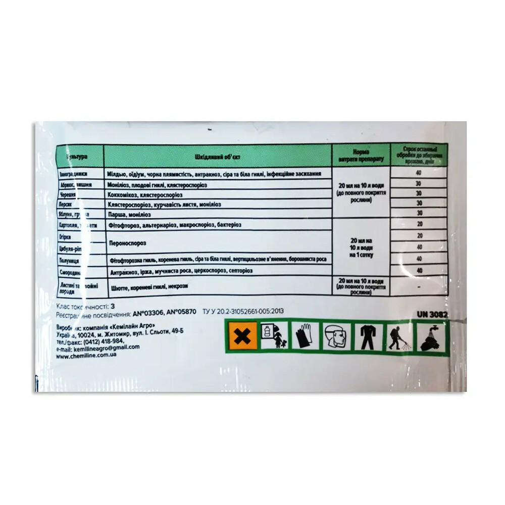 Для обробки картоплі, інших овочів, а також квітів потрібно розвести в 5 л води 20 мл засобу. Такого обсягу достатньо для 1 сотки. Вносити слід на початку активного росту і при появі перших ознак захворювання.