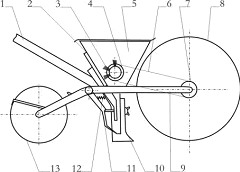 Висівний апарат представляє собою корпус, на якому змонтовані: бункер для насіння 5 з поворотним диском 2 в задній частині, сошник 10 із сім'япроводом, щітковий мexанізм 3 з приводом клапана 11 сошника, загортач.
