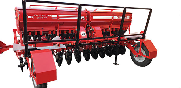 • дводисковими сошниками на 4-х опорно-приводних колесах +  прикочуючі катки + загортачі.