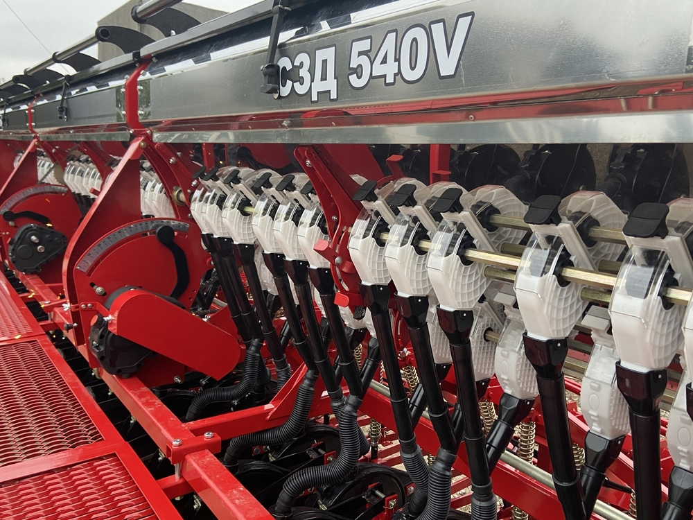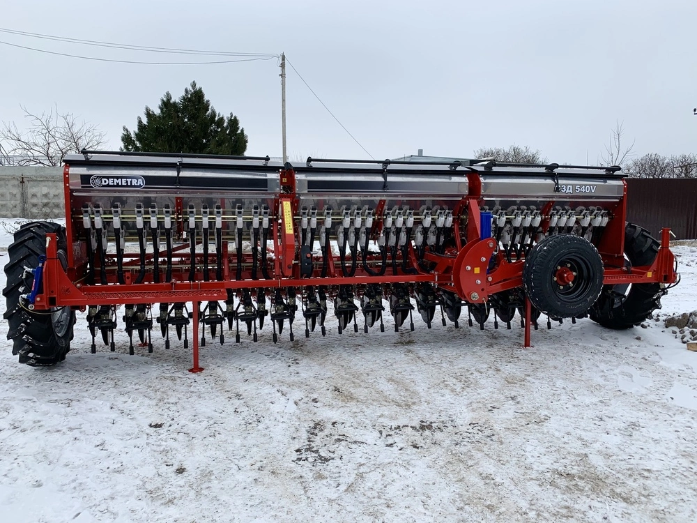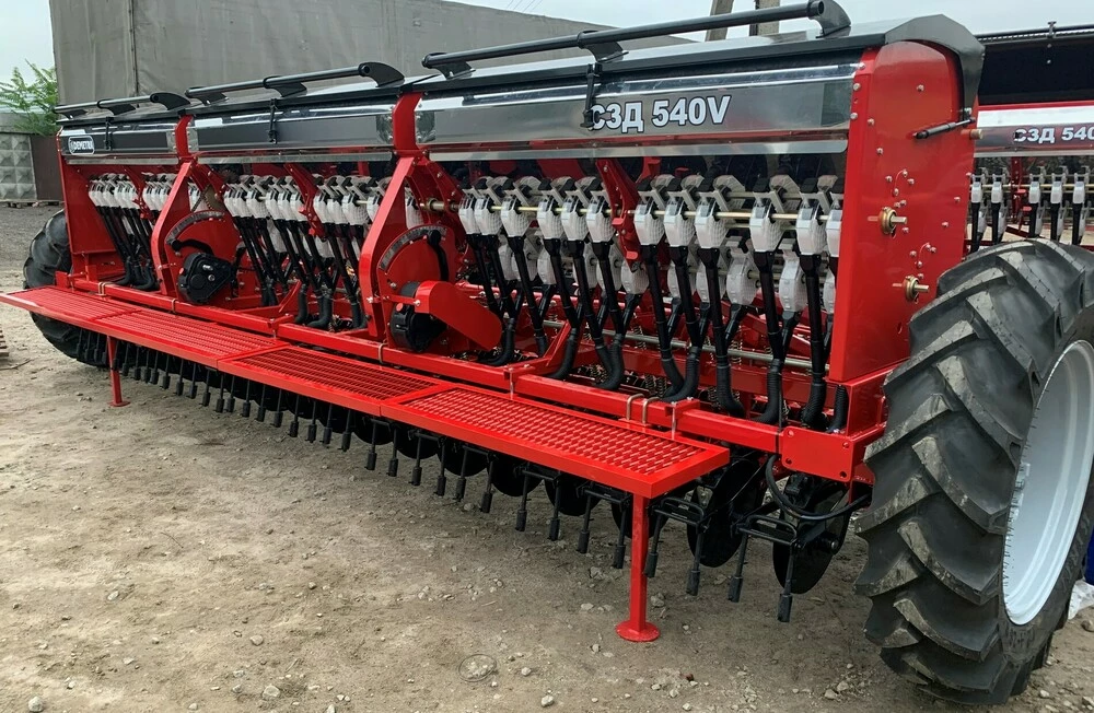 Сівалка зернова СЗД 540V, c безступінчастою коробкою передач(варіатор), призначена для рядового посіву зернових культур (пшениці, ячменю, жита, ов са), зернобобових (соя, горох, квасоля, нут, сочевиця, боби), дрібнонасіннєвих культур (ріпак, гірчиця, льон) сипучих і середньо сипких насіння трав з одночасним внесенням мінеральних добрив.