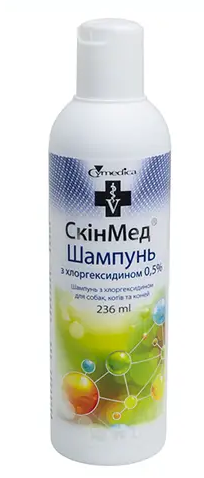 Шампунь Cymedica SkinMed - з хлоргексидином допомагає в протидії розвитку шкірних інфекцій бактеріальної етіології. Очищає шерсть і шкіру, має дезодоруючу дію і відновлює блиск волосся у тварин.