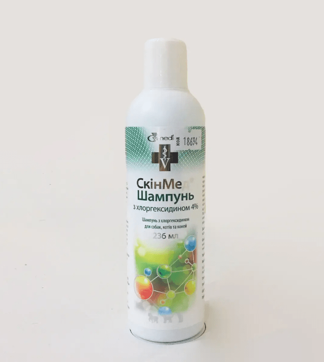 Шампунь Cymedica SkinMed - з хлоргексидином допомагає в протидії розвитку шкірних інфекцій бактеріальної етіології. Очищає шерсть і шкіру, має дезодоруючу дію і відновлює блиск волосся у тварин.