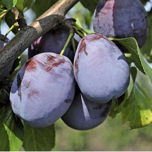 Слива "Амерс" – это дерево среднерослое, формирует разреженную крону, молодые побеги которой склонны к вертикальному расположению. Урожайность высокая, стабильная. Плоды крупные, весом 50-60г, овальной формы, слегка уплощенные. Кожица фиолетово-голубоватая или бордово-голубоватая, с небольшим восковым налетом.
