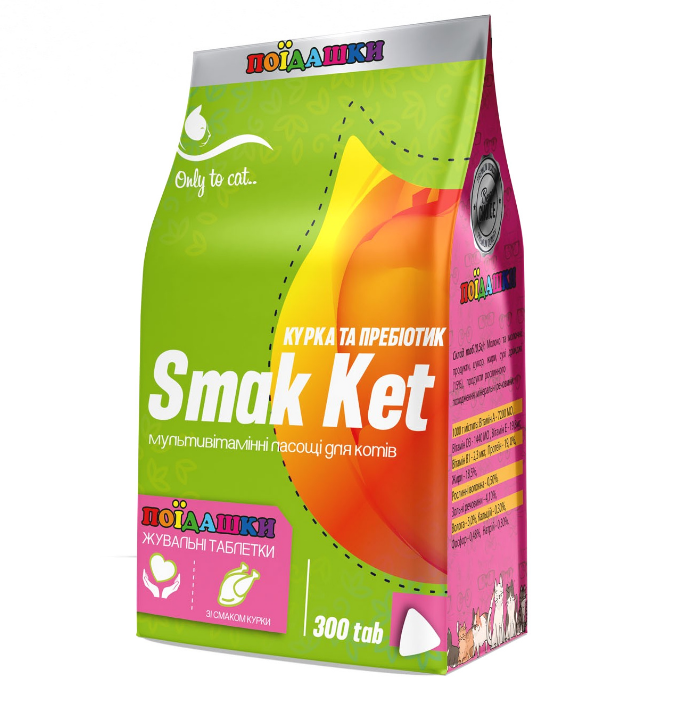 Жувальні таблетки Smak Ket КУРКА І ПРОБІОТИК - це одночасно вітаміни та смачні ласощі для Вашого вихованця. Вони містять весь список необхідних вітамінів і амінокислот для гарного самопочуття і настрою. Відрізняються високим поїданням і можуть використовуватися для ігор і заохочення. Виготовлені на основі молока і молочних продуктів, які забезпечують організм улюбленця кальцієм, важливою речовиною для здоров'я зубів і кісток, і містять у складі м'ясо курки, як додаткове джерело протеїну.