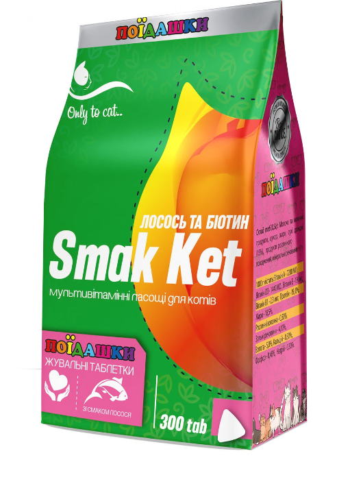 Мультивітамінна харчова добавка для котів Smak Ket ЛОСОСЬ І БІОТИН - це одночасно вітаміни і смачні ласощі для Вашого вихованця. Зроблені у вигляді привабливих таблеток, які містять весь список вітамінів і амінокислот необхідних для гарного самопочуття і настрою тварини. Відрізняються високим поїданням і можуть використовуватися для ігор і заохочення. Вітаміни є біологічно активними речовинами, що виконують важливі функції в організмі тварин. Складові багатьох ферментів утворюють різні комплексні сполуки з білками, вуглеводами, жирами, гормонами, відіграючи важливу роль в обміні речовин. Деякі з них синтезуються в організмі, а деякі потрапляють з їжею. На жаль, не завжди раціон Вашого улюбленця може бути збалансований за всіма показниками, тому вітаміни вводять у раціон додатково.