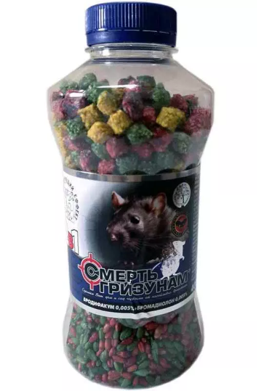 Состав: зерно, крупа экструдированная (гранула), привлекатель, горечь, краситель, вспомогательные вещества, действующее вещество - бродифакум (0,005)%, бромадиолон (0,005).