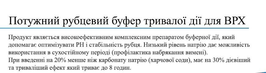 Данный продукт является высокоэффективным комплексным препаратом буферного действия, который помогает оптимизировать РН и стабильность рубца. Низкий уровень натрия дает возможность использования в сухостойный период (профилактика набухания вымени). При введении на 20% меньше чем карбоната натрия (пищевой соды), имеет на 30% более действенный и длительный эффект который длится до 8 часов.