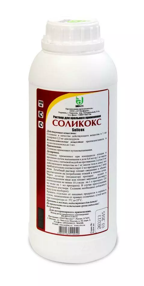 птиці: 0,4 мл на 1 кг маси тіла на добу протягом 2 діб, що при відповідає 2 мл препарату на 1 л води, або 1 мг діючої речовини (диклазурилу) на 1 кг маси тіла на добу;