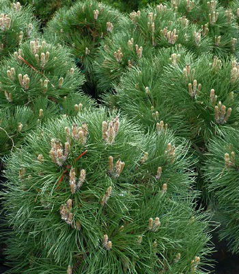 Карликовий різновид чорної сосні з кулястою або широко пірамідальною кроною. Хвоя темно-зелена, щільна, голчаста, розташована в пучках по дві штуки (довжиною 10см). Шишки округлі, жовто-коричневі (2-3см), чудово виглядають на фоні темної хвої. Світлолюбна, абсолютно не переносити тіні.