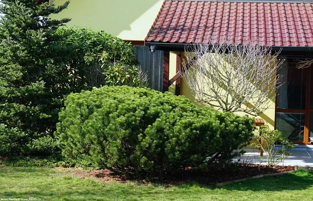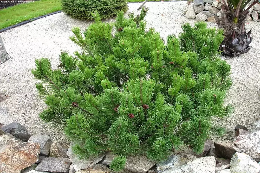Пагони: різної довжини, щільно розташовані, гілки спрямовані нагору. Хвоя різна за довжиною, але найчастіше коротка. Шишки: симетричні, майже сидячі, яйцеподібні до округлих, при дозріванні темно-коричневі, верхня частина апофізу опукла, наріст у середині стислий. Широко поширена як садова культура – Зимостійка.