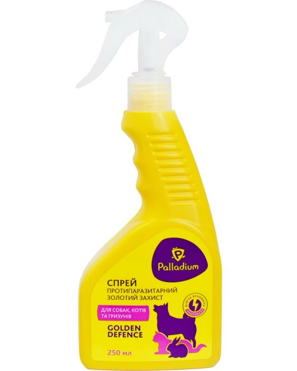 Спрей Golden Defence - інсектоакарицидний препарат, який призначений для знищення бліх, вошей, волосоїдів та іксодових кліщів, що паразитують на тваринах, а також для захисту від їх нападу.
