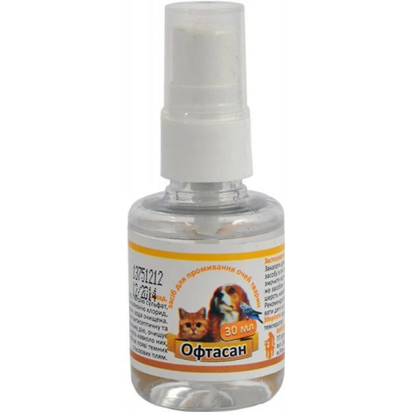 Офтасан – засіб для промивання очей тварин (кішок, собак, кролів, дрібних гризунів, птахів). Має антисептичну та пом'якшувальну дію очищає очі і перстя (пір'я) навколо них, запобігає появі темних слізних плям.