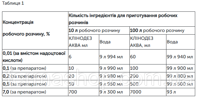 Клінодез Аква застосовується для дезінфекції з метою профілактики та вимушеної дезінфекції всіх видів тваринницьких та птахівничих приміщень, у молочному тваринництві, харчовій промисловості, забійних та м´ясопереробних цехів, продовольчих ринків, ветпунктів, амбулаторій, лабораторій, транспортних засобів, обладнання, інвентарю, тари. Клінодез Аква ефективний в широкому діапазоні температур, що дозволяє застосовувати засіб при низьких температурах до мінус 20° С. Робочі розчини засобу Клінодез Аква, призначені для дезінфекції різних об’єктів, готують у пластикових, емальованих (без ушкодження емалі) ємностях шляхом додавання до води відповідних кількостей засобу (Таблиця 1).