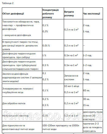 Дезінфекцію проводять методом автоматизованого миття, ручного протирання, зрошення, заповнення. Засіб слід рівномірно нанести на поверхню до повного її змочування (Таблиця 2). ! Після заключної дезінфекції водопровідних систем залишки препарату змити водопровідною водою. З інших поверхонь змивати залишки препарату не потрібно.