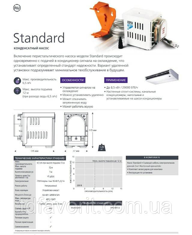 Насос Standard Pump перистальтичного принципу дії. Працює не за датчиком рівня, а безперервно за наявності сигналу від компресора (при цьому може перекачувати як конденсат, так і повітря. Немає шуму під час сухих стартів, як у вібраційних насосів).