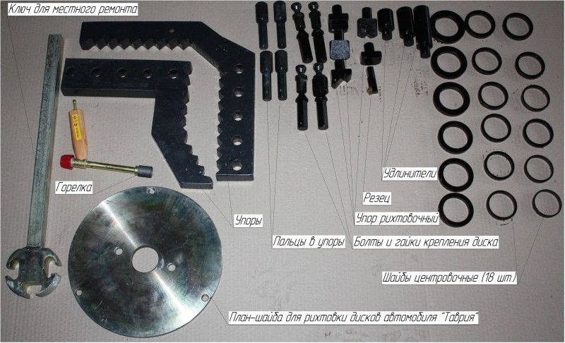 Рихтування диска проводиться за допомогою гідроциліндра встановленого в один з упорів передбачених на верстаті і керований рукояткою гідрорасспределітеля. Місце рихтування на диску попередньо необхідно підігріти пальником (з верстатом не поставляється).