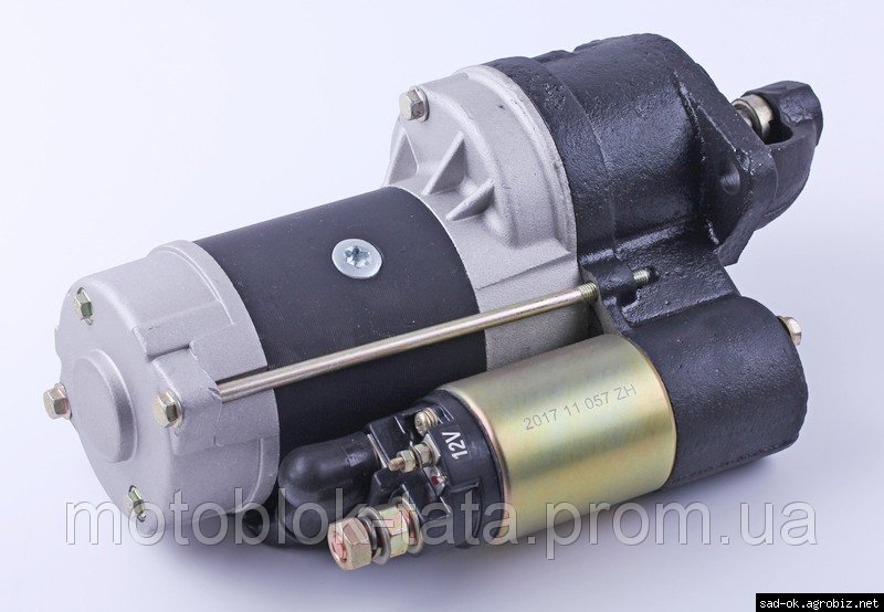 Стартер электрический Z-10 (12V) - 190N (редукторный) подходит на дизельные двигатели мотоблоков и мототракторов мощностью 10 л.с. с водяным охлаждением. Количество зубов: Z-10. Мощность: 9.9Kw. Посадочное место под кронштейн: ?75mm. Межболтовое расстояние: L-112mm. Корпус: чугун + металл. Вес: 7250 гр.