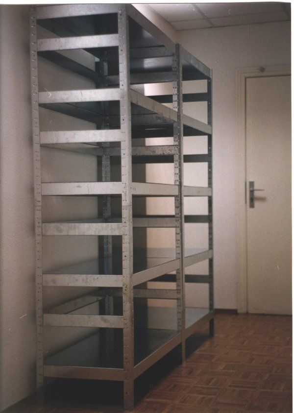 Стелажі оцинковані архівні власного виробництва. Виготовляються з оцинкованої сталі або холоднокатаної сталі з полімерним порошковим покриттям. Основні використовувані кольори - білий (RAL-9016) і сірий (RAL-7040). Каркаси стелажів робимо зі сталі товщиною 0,8; 1,0; 1,2 і 1,5 мм. Полиці для стелажів виготовляються зі сталі товщиною 0,5; 0,63 і 0,8 мм або з ДСП шліфованого або ламінованого товщиною 16 мм. Також можливе виготовлення полиць зі скла.