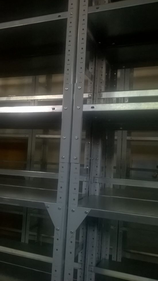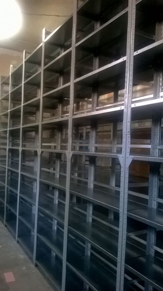 Універсальні поличні стелажі виготовляються без планок. Профільовані полиці з висотою борту 25 мм кріпляться до стійок через кутові підсилювачі болтовими з'єднаннями. Така конструкція дозволила істотно заощадити на матеріалах для виробництва металевого стелажа і, відповідно, знизити його ціну.