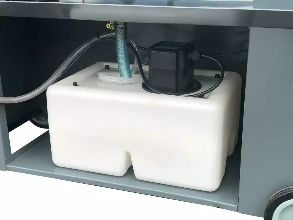 Бажана лінійна швидкість ременя досягається шляхом зміни передавального відношення на шківах між черв'ячною передачею та приводним двигуном. Резервуар охолоджуючої рідини з електронасосом розміщений на підставі.