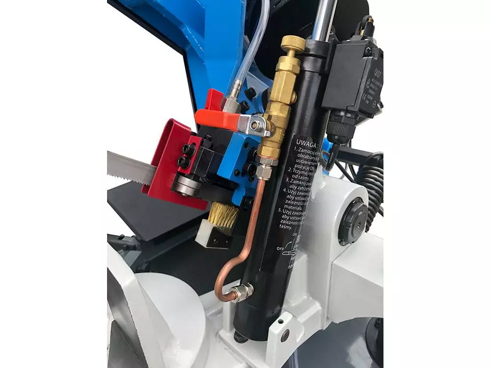 У нижньому положенні (після закінчення різання матеріалу) привод ріжучої стрічки та система охолодження автоматично відключаються. Безпека забезпечується кожухами ріжучої стрічки та мікровимикачами, що зупиняють двигун після циклу різання або при відкритті будь-якої кришки. Додатковий захист полягає в автоматичному відключенні у разі поломки ріжучої стрічки.