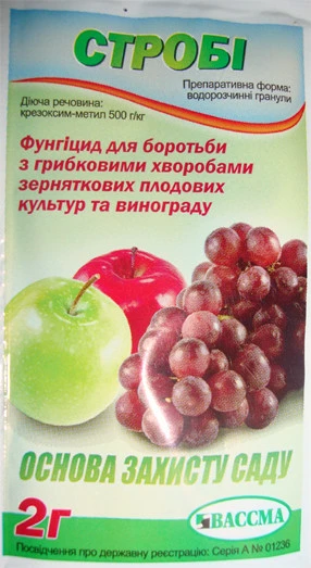 Стробі - володіє фунгіцидними властивостями в боротьбі з широкий спектр грибних хвороб плодових культур і винограду. Препарат ефективно пригнічує гриби, які з'являються на поверхні листя.