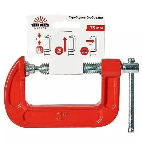 Струбцина G-подібна Vitals Master 75 мм призначена для затискання та фіксації заготівель та деталей при склеюванні та інших слюсарних роботах.