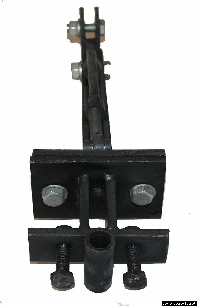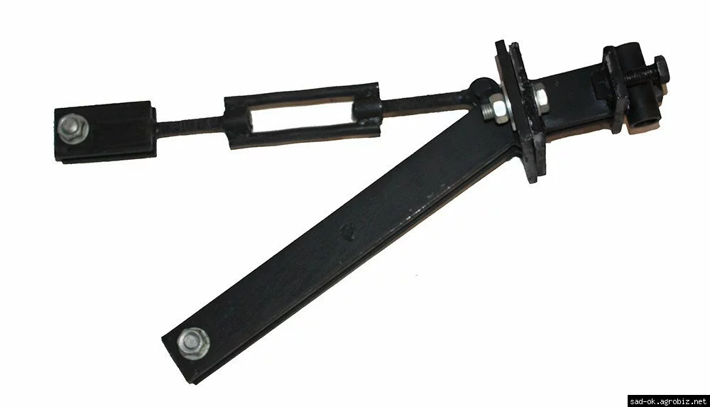 Механизм регулировки угла атаки - талреп. Поворотный механизм (болтовой зажим) сцепки дает возможность плугу работать под прямым углом к земле, в то время как мотоблок может находится в смещенном положении, одним колесом в борозде.