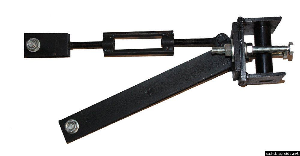 Механизм регулировки угла атаки - талреп. Поворотный механизм (болтовой зажим) сцепки дает возможность плугу работать под прямым углом к земле, в то время как мотоблок может находится в смещенном положении, одним колесом в борозде.