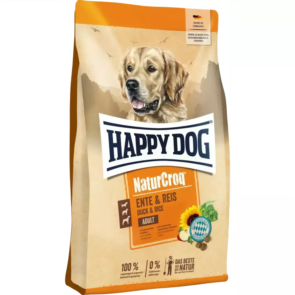Сухий корм Happy Dog Naturcroq Duck&Rice – це збалансований повнораціонний корм. Хрусткі крокети містять високоякісні інгредієнти, такі як смачна качка, легкозасвоюваний рис і корисні цільні зерна з регіону. Качка забезпечує вашу собаку високоякісним тваринним білком і дає їй сили. Цільнозернові продукти забезпечують важливу клітковину. Клітковина допомагає регулювати роботу кишечника, сприяє травленню.Цільнозернові продукти також є важливими постачальниками вітамінів групи В, таких мінералів, як магній, залізо, селен і цинк. Смачний, засвоюваний рецепт також містить цінні місцеві трави, які природним чином забезпечують вашого чотириногого друга багатьма цінними поживними речовинами.