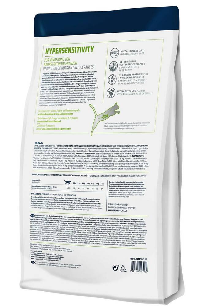 Happy Cat VET Diet Hypersensitivity використовується для зменшення виникнення непереносимості поживних речовин. Основними особливостями цього гіпоалергенного рецепту є ексклюзивне джерело тваринного білка перепілки (у поєднанні з джерелом рослинного білка картопляного білка) та незвичайне джерело вуглеводів італійського солодкого каштана, які є ідеальною основою для елімінаційної дієти. Рецепт, який дуже добре переноситься, забезпечує високий рівень сприйняття, а помірні рівні білка та жиру сприяють хорошому фізичному стану вашої кішки, навіть якщо використовується протягом тривалого часу.