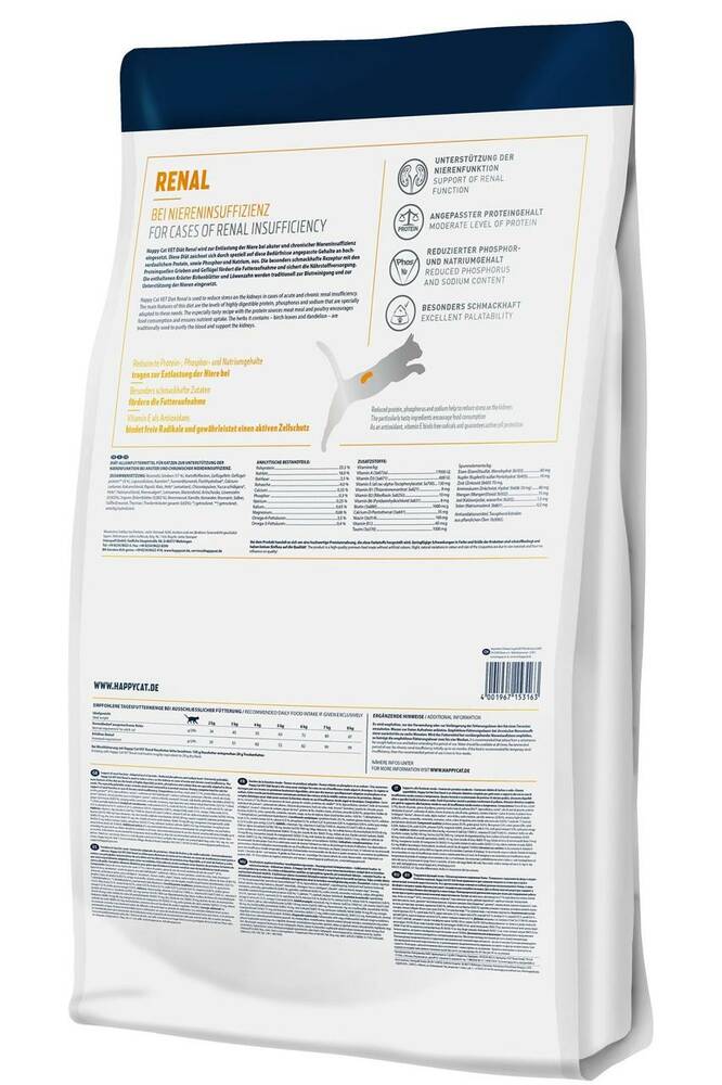 Сухий корм Happy Cat VET Diet Renal використовується для зниження навантаження на нирки при гострій та хронічній нирковій недостатності. Основними особливостями цієї дієти є рівні легкозасвоюваного білка, фосфору та натрію, які спеціально адаптовані до потреб кішок із захворюваннями нирок. Особливо смачний рецепт з м'ясним борошном із джерел білка та птицею спонукає вашу кішку їсти більше і забезпечує засвоєння поживних речовин. Трави, що містяться в ньому, - листя берези і кульбаби - традиційно використовуються для очищення крові і підтримки нирок.