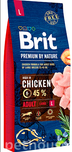 Brit Premium Adult L – це корм для дорослих собак великих порід, вагою від 25 до 45 кг. Корм складається з якісного м’яса відокремленого від кісток, що підвищує смакову привабливість раціону Brit Premium, та покращує засвоюваність корму.