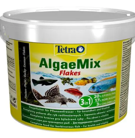 Тетра АлджіМікс - це високоякісний корм у вигляді пластівців, який спеціально розроблений з урахуванням особливих потреб всіх видів травоїдних декоративних риб. Складається зі збалансованої суміші спіруліни (20%), норі (17%) і хлорели (3%). Суміш цих водоростей містять життєво необхідні елементи, білок, вітаміни і мінерали, а ще в них міститься велика кількість незамінних жирних кислот. Таким чином, вони сприяють оздоровленню імунної системи і підтримці життєвих сил і забарвлення.