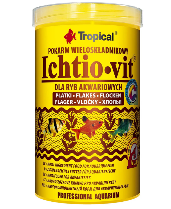 Багатокомпонентний корм у вигляді пластівців, отриманий з високоякісних, добірних, компонентів тваринного і рослинного походження. Призначений для щоденного годування всеїдних риб. Оптимально збалансований склад і відповідний набір вітамінів і мікроелементів забезпечує правильний ріст і розвиток риб, а також покриває їх енергетичні потреби. Ichtio-vit особливо охоче використовують у промисловому рибництві, поряд зі спеціальними кормами лінії premium та professional.
