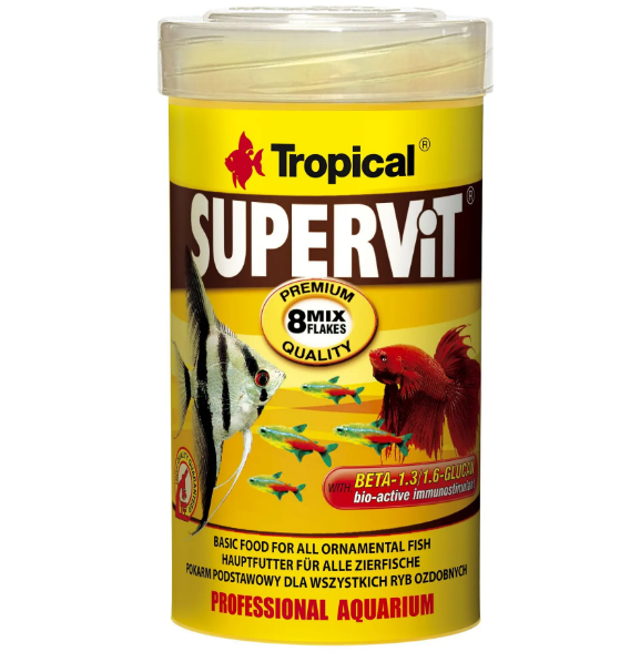 Supervit є повноцінним багатокомпонентним пластівчастим кормом найвищої якості, призначеним для щоденного годування всіх акваріумних риб. Компоненти корму враховують різні харчові потреби різних видів риб, що вирощуються одночасно. Вміщені в кормі: натуральний імуностимулятор Бета-1,3/1,6-Глюкан і стабілізований вітамін С ефективно зміцнюють імунологічну систему риб, захищаючи їх від інфекцій. Клітковина і хітин регулюють процес травлення і виділення, каротиноїди інтенсифікують забарвлення, а лецитин підвищує вітальність і сприяє розмноженню. Добавка цеоліту сприятливо впливає на травну систему і видалення токсинів з організму риб.