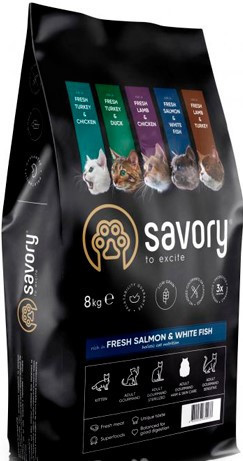 Ексклюзивна рецептура корму була розроблена досвідченими європейськими фахівцями з харчування хатніх улюбленців. Використовуючи холістичний підхід, вдалося створити біологічно відповідний, здоровий раціон для кішок, який є таким корисним і смачним, що лапки оближеш. Поєднання добірних натуральних інгредієнтів дає змогу піклуватися про здоров'я чотириногого, а вишуканий смак — дарувати йому насолоду від щоденного споживання корму Savory. Сухий корм для кішок Savory містить свіже м'ясо лосося і висушене м'ясо білої риби, ягоди, фрукти та овочі. Ці компоненти створені природою, щоб забезпечити збалансоване функціонування організму котика та надати його шерсті надзвичайний вигляд.