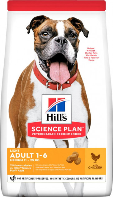 Легкий корм для дорослих собак Hill's Science Plan Light Adult з куркою ідеальний для менш активних дорослих собак, які потребують низькокалорійного раціону для підтримки здорової ваги та способу життя. Апетитний корм із куркою для тих, хто цінує різноманітність у раціоні.
