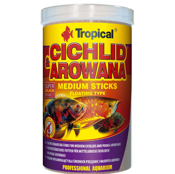 Cichlid & Arowana Medium Sticks є повноцінним, багатокомпонентним висококалорійним кормом у формі плаваючих стіксів для щоденної годівлі середніх цихлід і молодих арован. Природні імунні стимулятори - Beta-1,3/1,6-Glucan і стабілізований вітамін С - зміцнюють імунну систему і забезпечують збільшення активності у риб. Спеціальний комплекс природних каротиноїдів збагачує чудове забарвлення цих риб.
