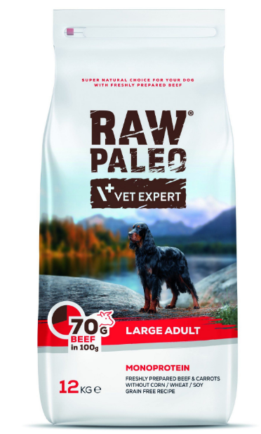 Сухий корм Vet Expert Raw Paleo (Вет Експерт Роу Палео) Adult Large Breed, з яловичиною – повнораціонний корм для дорослих собак великих і гігантських порід від 1 року з вагою тіла від 25 кг. Формула корму беззернова і монобілкова, а це означає, що єдиним джерелом тваринного білка є легкозасвоювана яловичина. Олія лосося та олія огірочника підтримують стан шкіри та якість шерсті, а новозеландські зеленогубі мідії, які є джерелом хондроїтин сульфату та глюкозаміну, позитивно впливають на розвиток кісткової системи та функціонування суглобів. Високий вміст свіжого м’яса гарантує високі смакові якості.